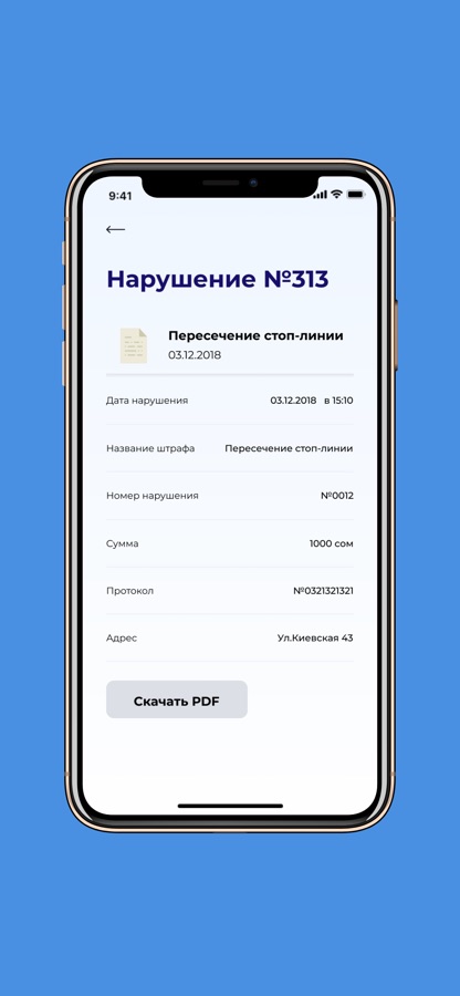 Приложение позволяет в онлайн режиме проверить наличие штрафов зафиксированных камерами. Источником информации является официальная база данных о нарушениях ГУОБДД МВД КР.