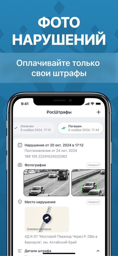 Приложение поможет своевременно узнать о штрафах ГИБДД и оплатить их со скидкой 25% в течение 20 дней с момента выхода постановления. Мы используем только официальные источники (базы данных ГИБДД, ФСС и Казначейства РФ), поэтому все данные о штрафах — достоверны.
