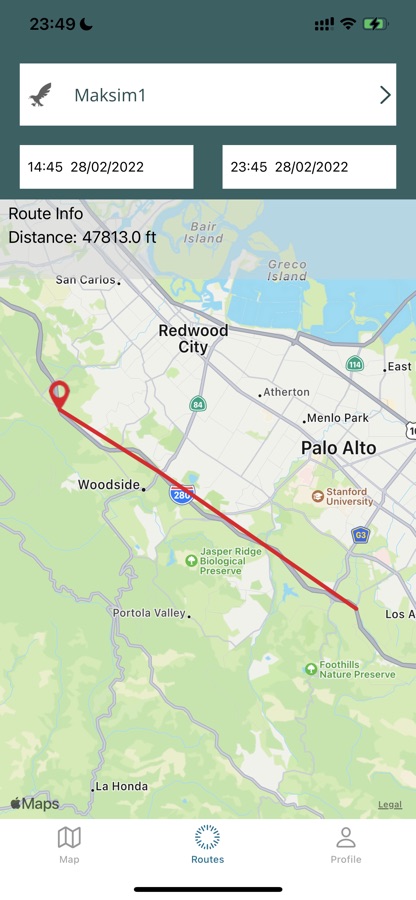 Просмотр пройденного маршрута, отслеживаемого Ребенка, за 30 предыдущих дней.