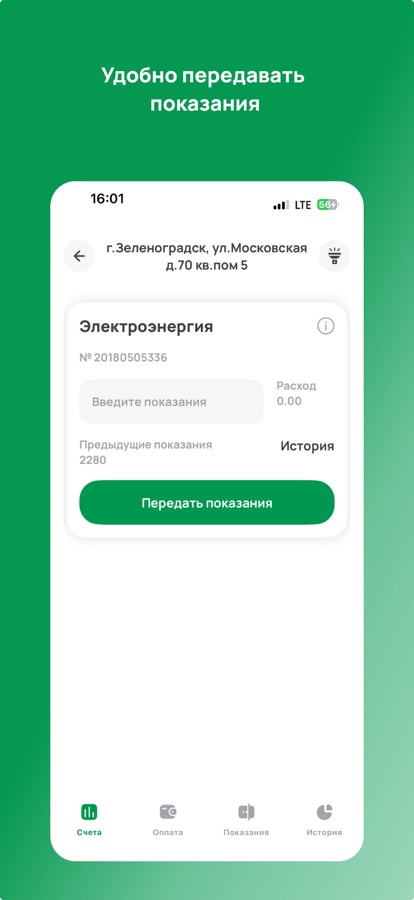 Забудьте о долгих звонках и очередях! Просто введите текущие показания ваших приборов учёта электроэнергии, воды и газа в удобное для вас время, и они будут мгновенно переданы поставщику услуг.