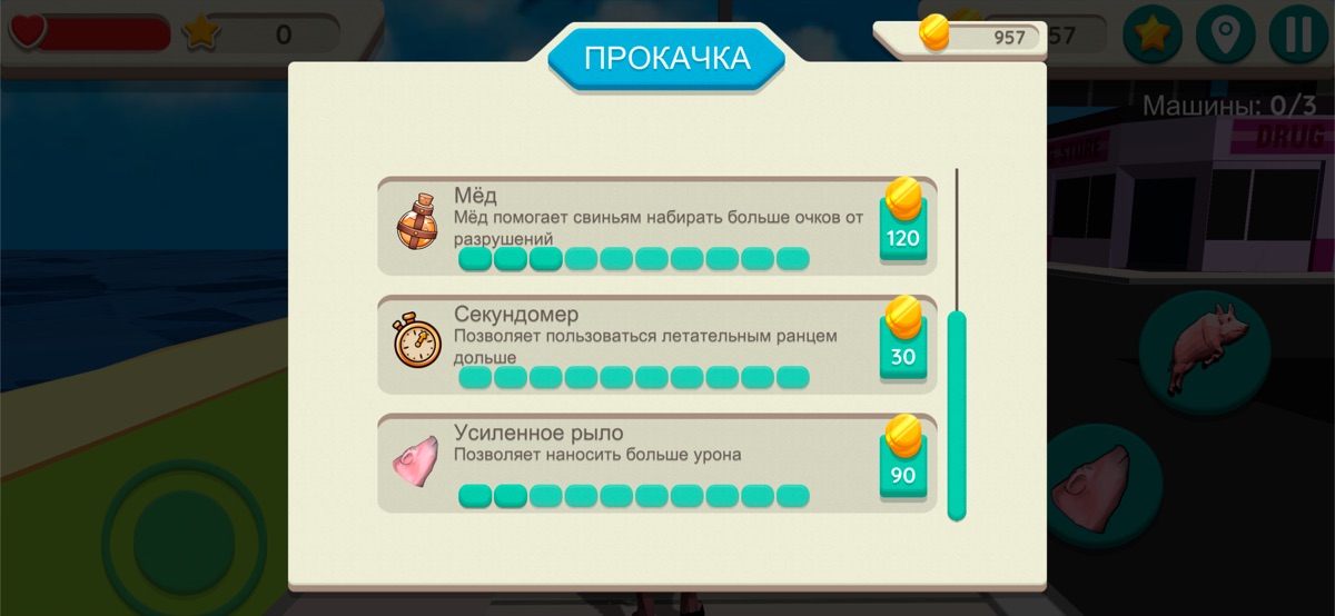 — Улучшай свинью! Ты можешь увеличить очки жизни, скорость, количество получаемых очков, время полета на реактивном ранце.