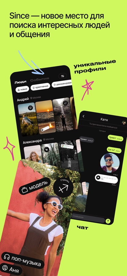 Открой для себя новых интересных людей в Since. Креативно создавай свой профиль и свободно общайся с помощью нашего чата. Здесь нет ничего лишнего — только люди.