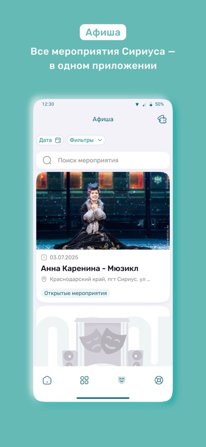 «Сириус» — просветительская среда» — это удобное мобильное приложение, которое объединяет все ключевые сервисы для жителей и гостей региона. Цифровой профиль жителя и гостя, афиша мероприятий, эксклюзивные бонусы, новости — всё в одном месте!