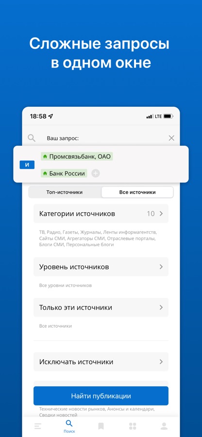 — быстрое создание поискового запроса с возможностью настройки по категориям и уровням источников;