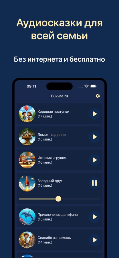 * возможность слушать сказки бесплатно и без интернета
