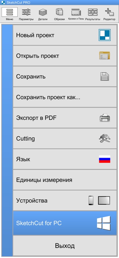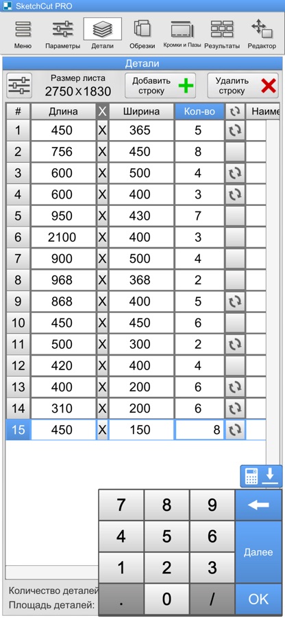 — сохранение списка деталей и параметров раскроя на Вашем устройстве;