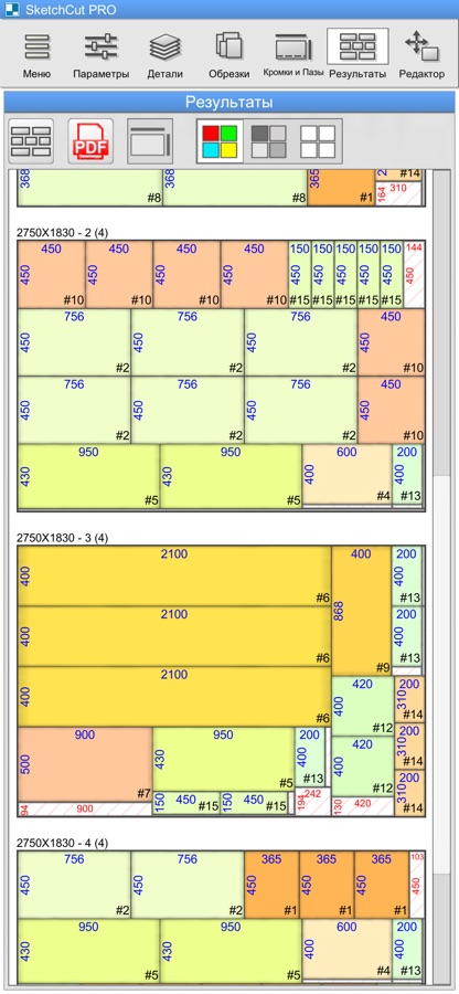 — автоматический подсчет площадей деталей и обрезков, длины реза, длины кромок;