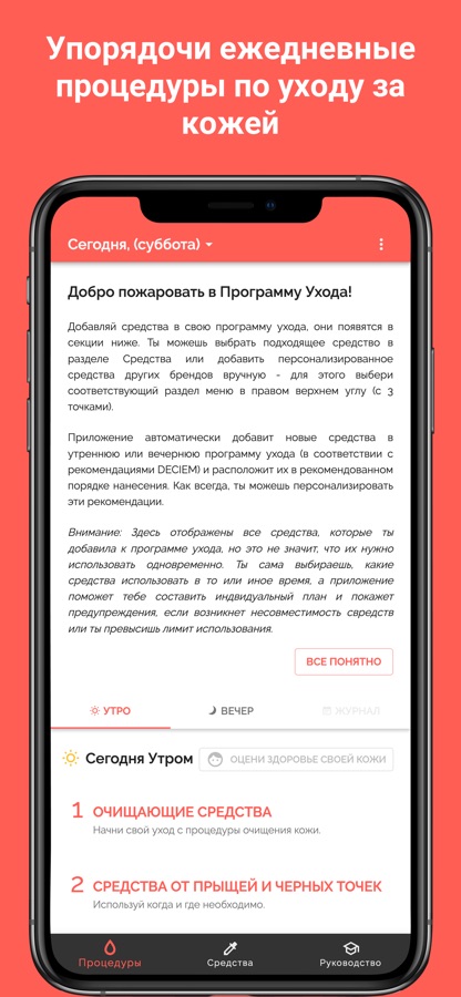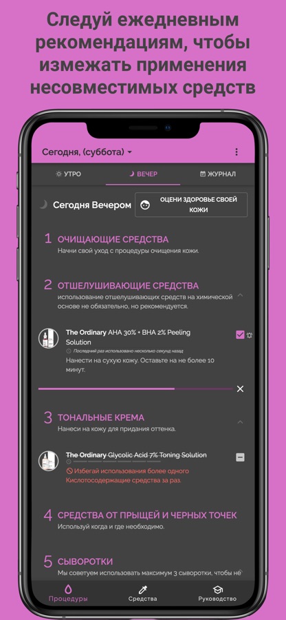Каждое утро и вечер отмечай средста, которые ты используешь. Это позволит приложению предупредить о возможной несовместимости продукции и показать, искользование каких средств стоит отложить.