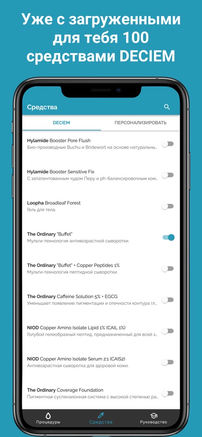 Создай персональный план по уходу за кожей, познакомься с разнообразием средств для ухода за кожей и косметикой, узнай, как и в какой последовательно использовать их, а также отслеживай их применение. В приложение входит продукция DECIEM (The Ordinary, NIOD, Hylamide & Fountain), но ты можешь добавлять любые средства других брендов: Drunk Elephant, Pixi Beauty, Paula’s Choice, The Inkey List, а также другие любимые тобой средства!