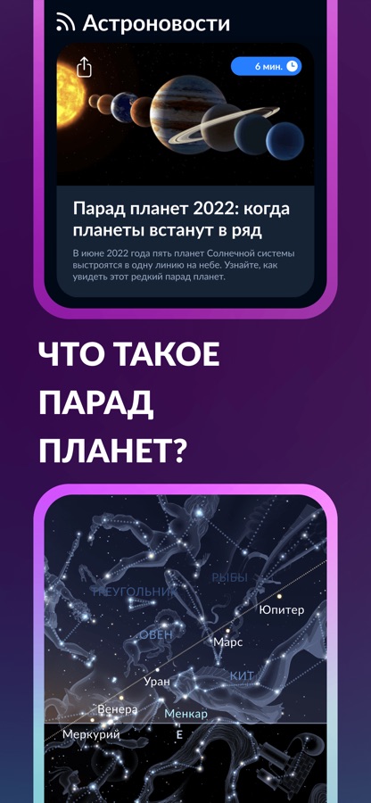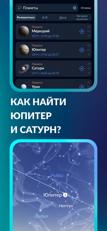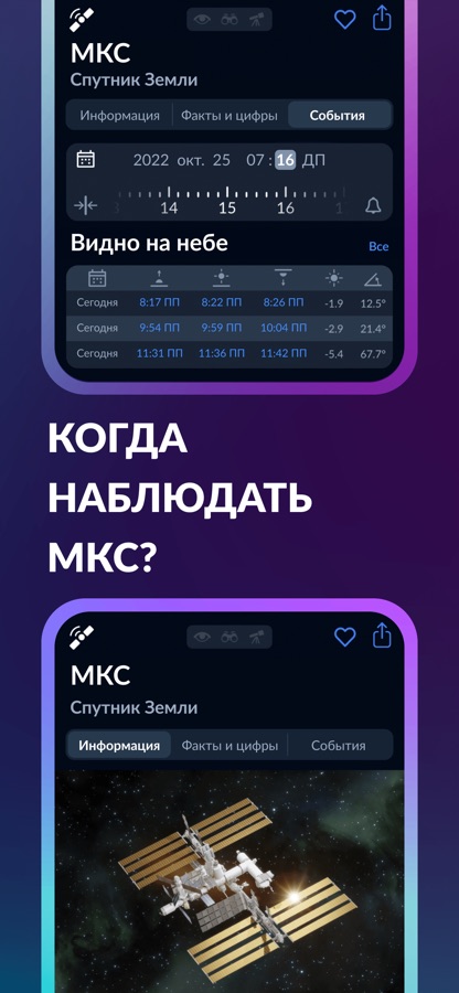 ► Наведите устройство на небо, чтобы увидеть положение космических объектов на интерактивной карте неба в реальном времени.