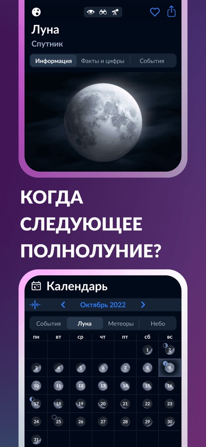 Устанавливайте напоминания о событиях на любые время и дату, чтобы не пропустить интересующие вас солнечное затмение, полнолуние или конфигурацию небесных объектов.