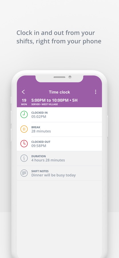 • Simplify time tracking: Allow employees to clock in and out right from their phones.