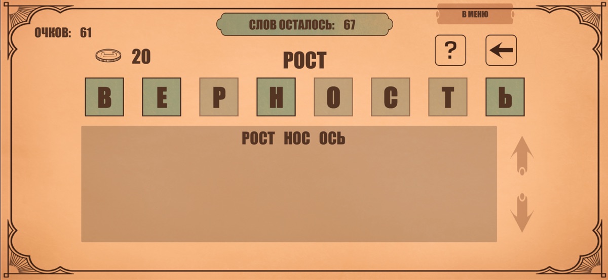 Игра состоит из уровней, каждый уровень — это новое слово. Составляя слова из слова, вы набираете очки — каждая буква составленного слова, это одно очко.