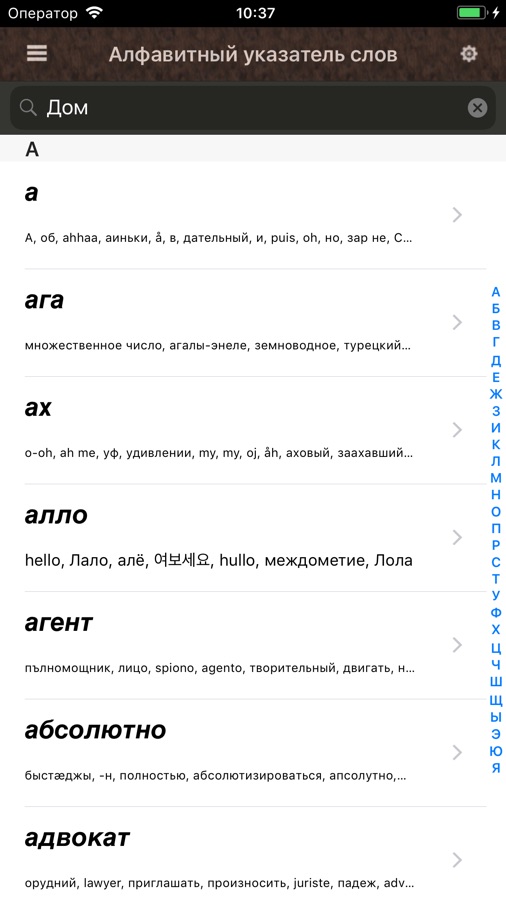 Приложение для русскоязычного словаря iOS. Содержит более 18 тысяч определений слов. Работает офлайн. После скачивания приложения подключение к Интернету не требуется. Все слова являются подлинно русскими и составлены на русском языке. Приложение подходит для тех, кто хочет изучать русский или уже свободно им владеет.
