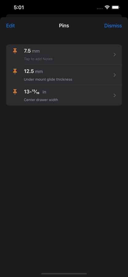 With the «Calculator» tool you can execute calculations across standard decimal and fraction values (in inches), as well as metric values (in millimeters). In Addition, you can tap on any value in the «transcript» output to see its equivalent in the alternate unit type/style. If you tap the icon next to a value you can add that value to the «Pins» view, which can be seen by tapping the icon in the lower right portion of the transcript view.