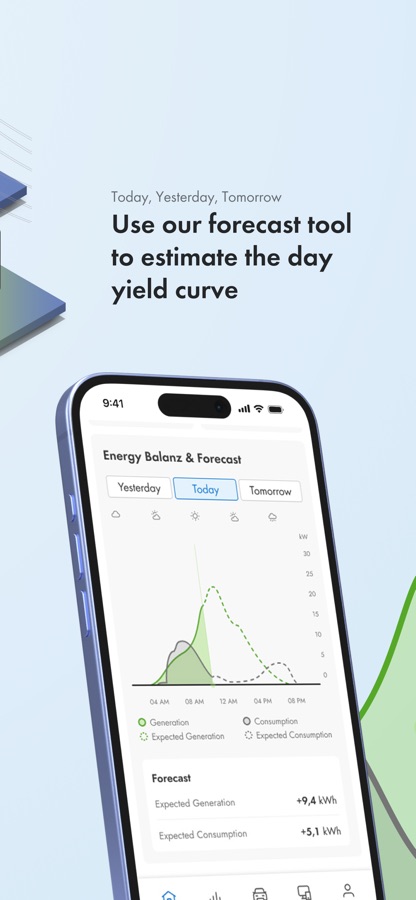 In the optimization area, you can view current forecasts for solar power production. The app shows you how to use your energy even more sustainably. For example, you can automatically utilize your own, self-generated solar power as efficiently as possible for your own needs and reduce your grid-supplied power.