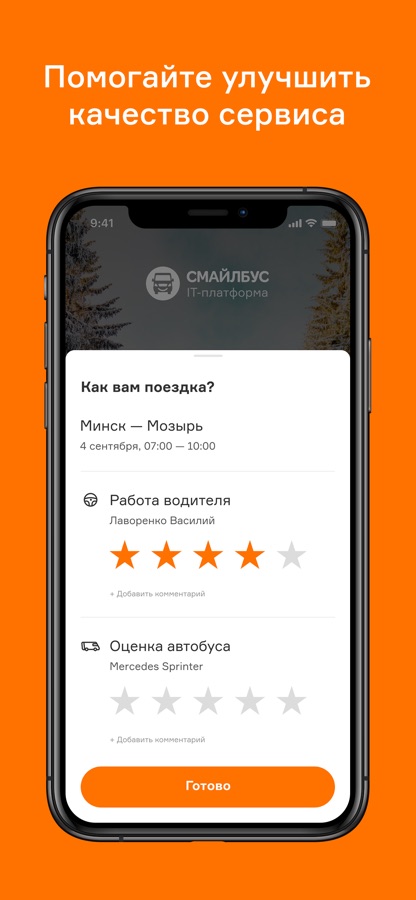 * вы можете оценить уровень комфорта автобуса и работу водителя, тем самым делая поездки ещё безопаснее.