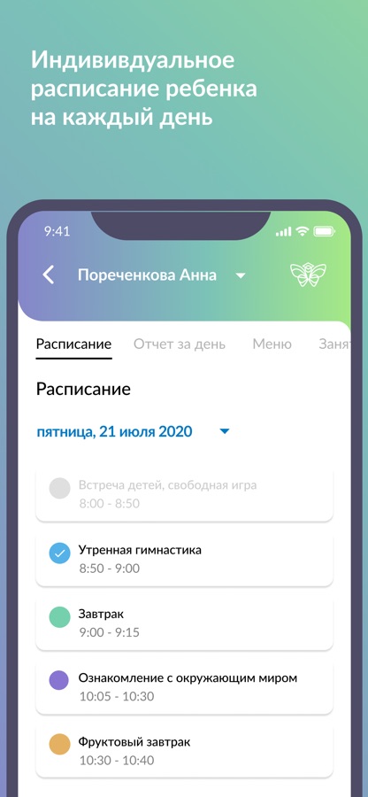 — Индивидуальное расписание ребенка с возможностью перейти на любой день календаря. В расписании собраны все групповые и индивидуальные занятия ребенка, режимные моменты, расписание групп дополнительного образования, праздники, мероприятия и пр.;