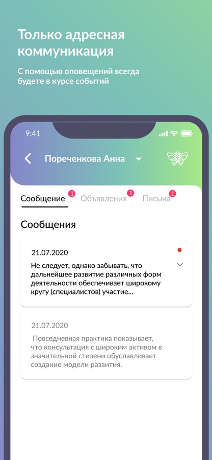 — Адресная коммуникация, представленная сообщениями, объявлениями и письмами. Нет общих чатов, «съедающих» время и подрывающих доверие участников;