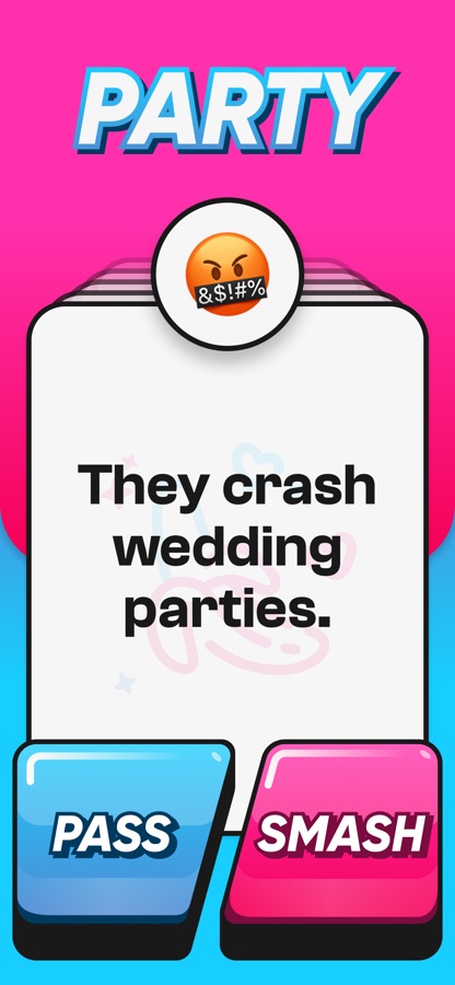 Smash or Pass is a group game in which you choose whether to “SMASH” (approve) or “PASS” (reject) a person based on a quirky and crazy scenario.