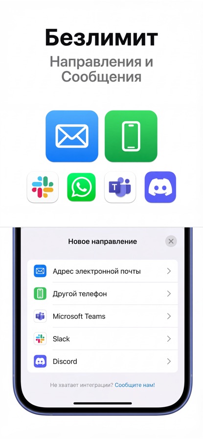 — Работает везде: отправляйте сообщения на Email, WhatsApp, Slack, Discord, Microsoft Teams, вебхуки или даже на другой телефон.