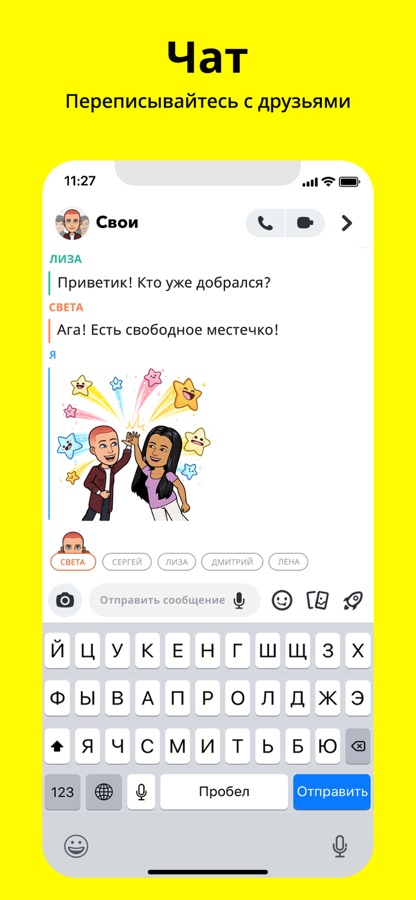 В Snapchat сообщения — это не просто текст. Вы можете отвечать видео, добавлять стикеры, рисовать поверх кадра, вставлять Bitmoji. Групповой видеочат собирает до 16 участников одновременно, причём каждый может накладывать свои линзы в реальном времени. Для близких друзей есть Friendmoji — эксклюзивные Bitmoji, созданные специально для вас двоих. Исчезающие сообщения добавляют лёгкости: после прочтения они пропадают через 24 часа, если вы не сохранили их в воспоминаниях. На iOS уведомления о новых сообщениях интегрируются в стандартный центр уведомлений, а ответить можно прямо из него.