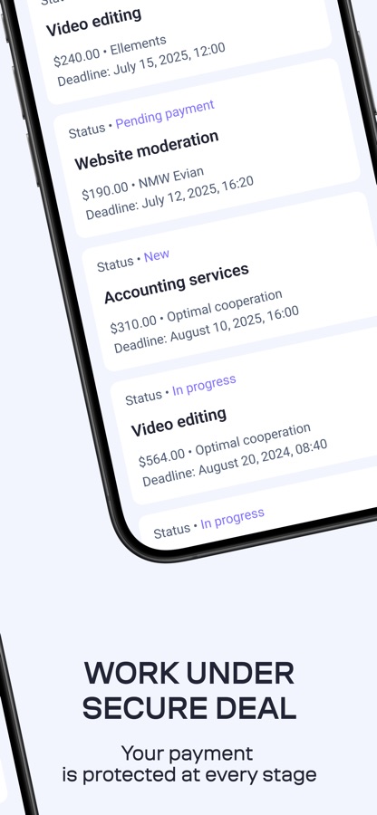 Получите приглашение от заказчика и начните работать с ним по безопасной сделке. Выполнили работу? Закройте задачу и получите оплату: на карту (Mastercard, Visa), расчетный счет или электронный кошелек. Вы и заказчик автоматически получите закрывающие документы и сможете отчитаться перед налоговой.