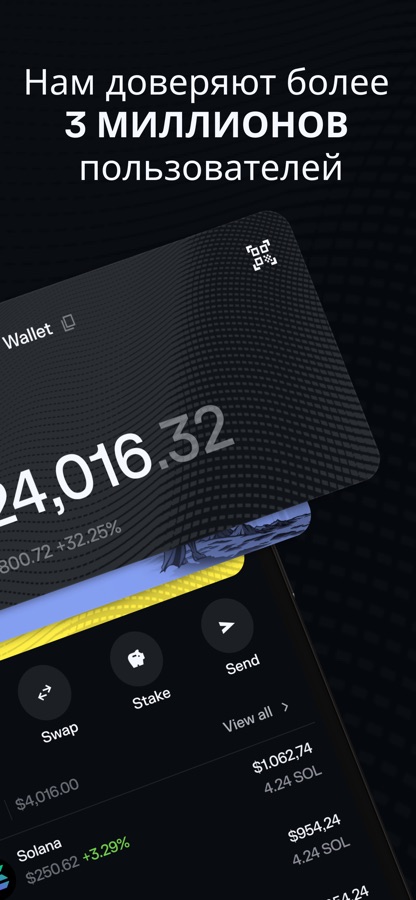 • Универсальное приложение и криптокошелёк для покупки, хранения и обмена крипты, а также для управления токенами и NFT на Solana.