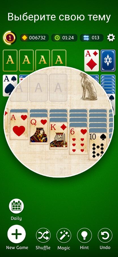 Думаете, у вас идеальная стратегия? Попробуйте ежедневные задания или играйте в неограниченное количество партий с выигрышными колодами! Испытайте терпение и выбирайте между классическим Солитером или системой очков Вегаса. Проходите ежедневные задания и настраивайте карты, стол и режим игры.