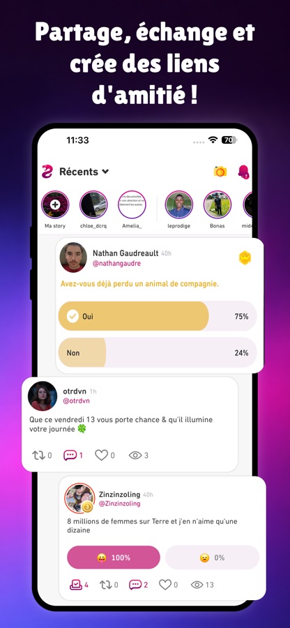 Exprime ta personnalité, partage ton quotidien et explore le contenu des autres membres. Les stories sont parfaites pour se faire des amis et briser la glace naturellement.