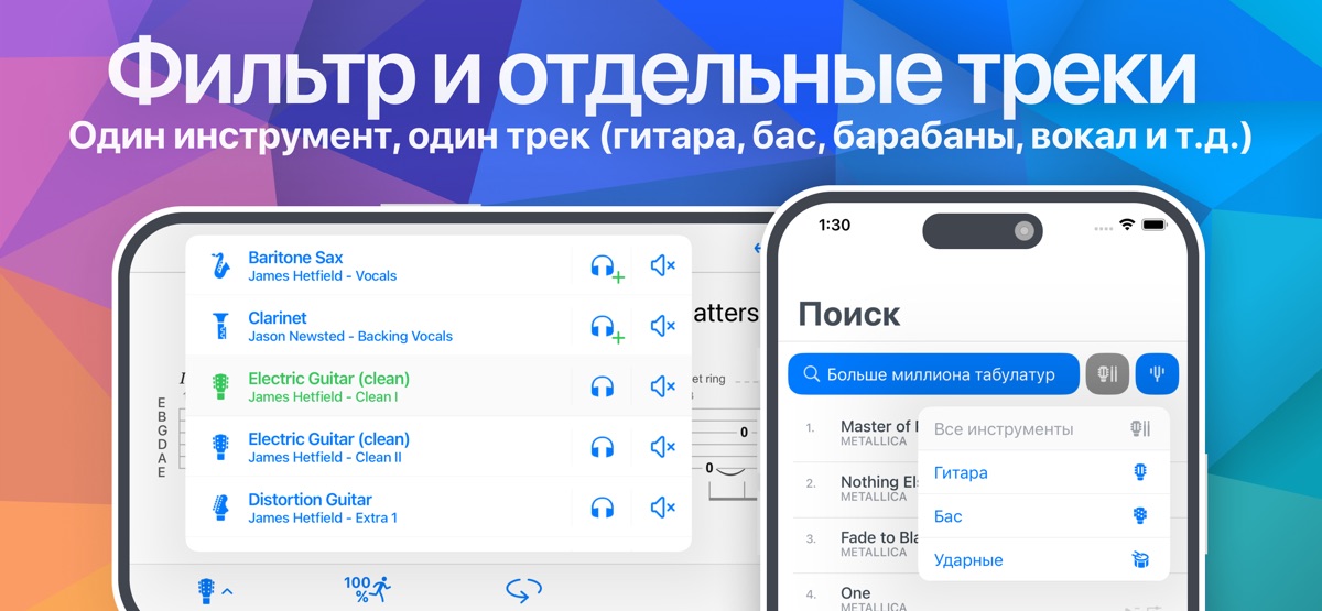 • Несколько инструментов. В большинстве песен есть табулатуры для разных инструментов (гитара, бас, барабаны, вокал и т. д.).