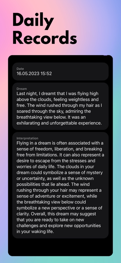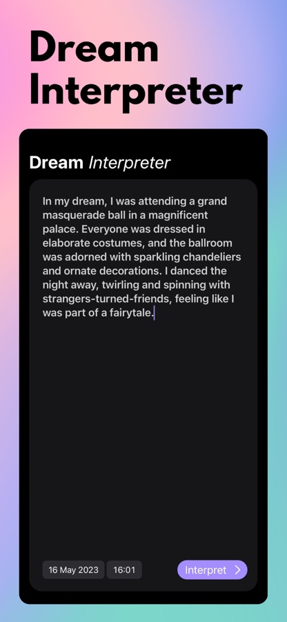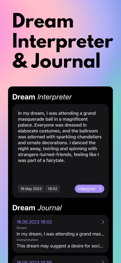 Толкование снов: Погрузитесь в царство символизма сновидений и раскройте значения, скрывающиеся за вашими снами. Dream Dictionary & Journal анализирует ваши записи в дневнике снов, предоставляя индивидуальные толкования, чтобы помочь вам понять эмоции, страхи, желания и послания, заложенные в ваших снах. Вы сможете лучше понять себя и свой жизненный путь, раскрыв секреты своего подсознания.