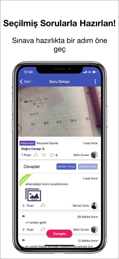 Sorularını sor cevaplansın! Takıldığın soruların fotoğrafını paylaşarak sorularına cevap bulabilirsin veya sorulmuş sorulara yanıt vererek kendini geliştirebilirsin. Sorun Kalmasın, soru bulma teknolojisiyle sorduğun soru daha önce sorulduysa anında bulur ve cevabını getirir. Ayrıca en popüler soru ve cevapları inceleyip bir adım öne geçebilirsin.