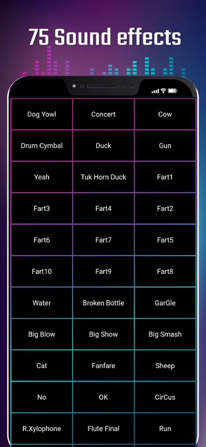Example sound effect in application : «Scratching» «Quack Quack», «OH NO!», «Kiss», «Fart Sound», «Ha Ha Ha», «Cry», «Cow», Gun», «I Love You», «Yee Haa», «Seedy», «Gargle», «Crap», «Sheep», «Mix Comical Sound», «Phone Vibrate», «Thunderstorm», «Raining» etc.
