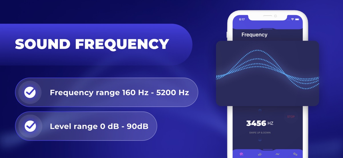Проведите пальцем вверх и вниз, чтобы повысить или понизить частоту тонов. Пользовательский интерфейс очень простой и понятный. Вы можете настроить частоту вверх или вниз точно на 1 Гц с помощью кнопки со стрелкой и напрямую проверить частоту с помощью профессиональной визуализации волны. Человек может слышать в диапазоне от 20 Гц до 20 000 Гц, и вы можете использовать генератор частот для проверки своего слуха.