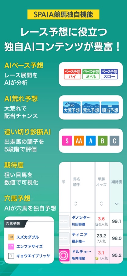 AIが各レースの展開をハイ、ミドル、スローの3段階で予想します。出走馬の脚質と照らし合わせたり、逃げ展開・差し展開に特化したAIの予想と組み合わせて的中率アップが見込めます。