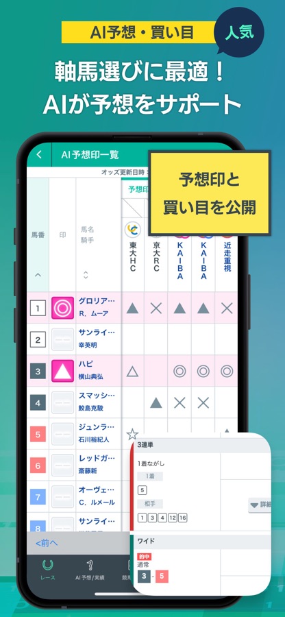 オッズ・購入では複数の券種を選択できて見やすい組合せ表示でサクサク買い目選択できる他、金額設定では便利な資金配分機能も搭載しています。