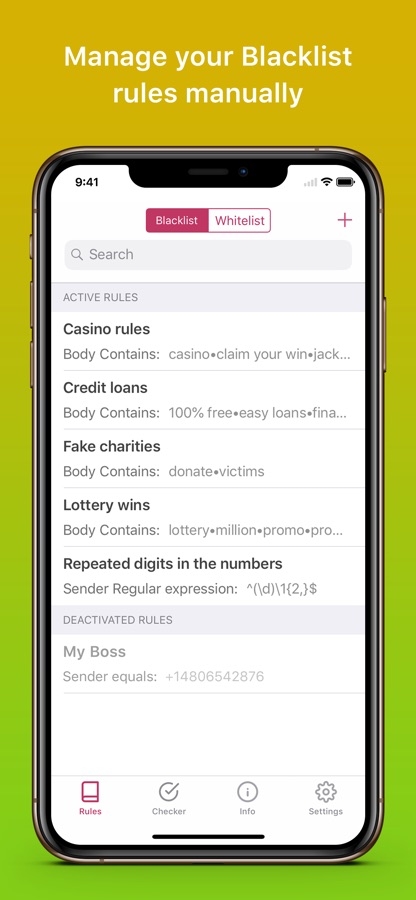 You can literally create any rule to filter as much spam as possible — from easiest “contains’ conditions and up to regular expressions and wildcard syntax magic. You can also use predefined rules to stop spam texts from short numbers and SMS containing links. Look for tips on creating Blacklist and Whitelist rules in the FAQ section.