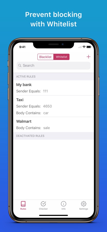 Blocking texts has become easier! Configure your filters and manage Blacklists and Whitelists manually with SMS blocker for free. Create rules and clear your message list from undesired content quickly and in an intuitive interface. Also, you can apply automatic rules to protect yourself from messages containing links or coming from any short numbers or emails.