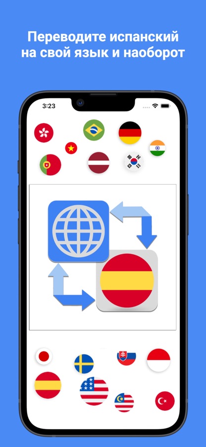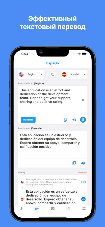 EspaGo — ведущее приложение-переводчик испанского языка с множеством выдающихся функций, таких как точный голосовой, текстовый и фотоперевод с испанского на 45 языков и наоборот.