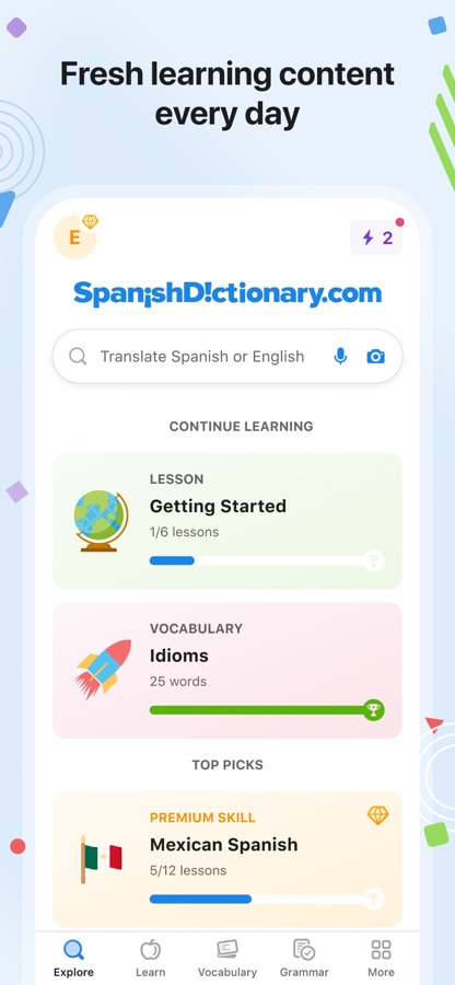 Learn Spanish online or offline for free with SpanishDictionary.com, the leading Spanish-learning app trusted by millions. Translate anything between Spanish and English, look up the conjugations for every Spanish verb, and practice with our interactive quizzes, lessons, and drills. Watch thousands of pronunciation videos, browse millions of example sentences, and learn a new word each day with the Word of the Day.