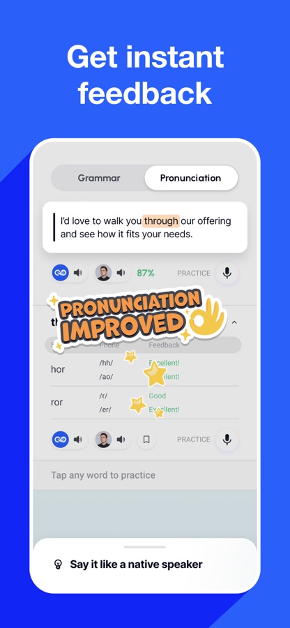 * Мгновенный перевод и распознавание речи для качественного обучения. Получайте моментальную обратную связь по произношению и грамматике.