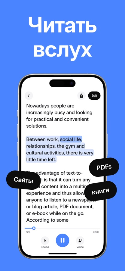 Speak4Me легко превращает текст в речь. Выбирайте из десятков голосов и языков, чтобы вслух озвучивать PDF, книги, статьи, сообщения и другое.