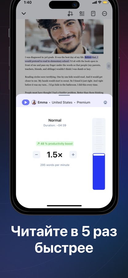 • Выбирай скорость прослушивания до 900 слов в минуту (в ~5 раз быстрее обычного чтения).
