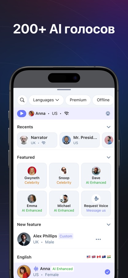 • Слушай голоса высокого качества на 50+ языках.