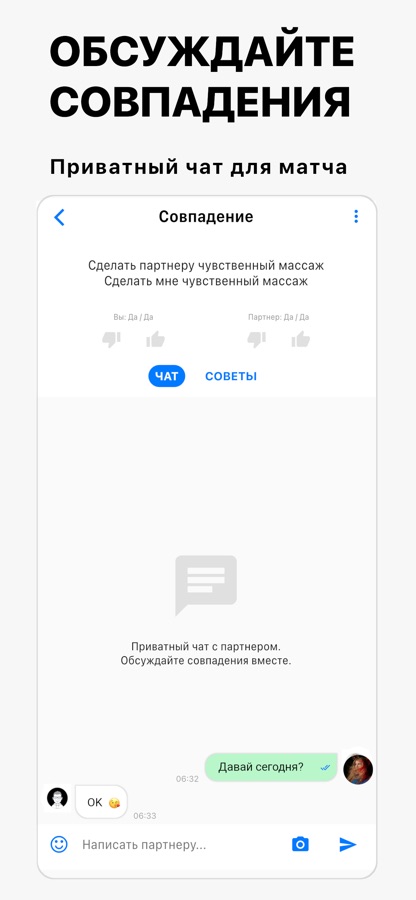 Приватный чат с вашим партнером. Обсуждайте совпадения, меняйтесь фото.