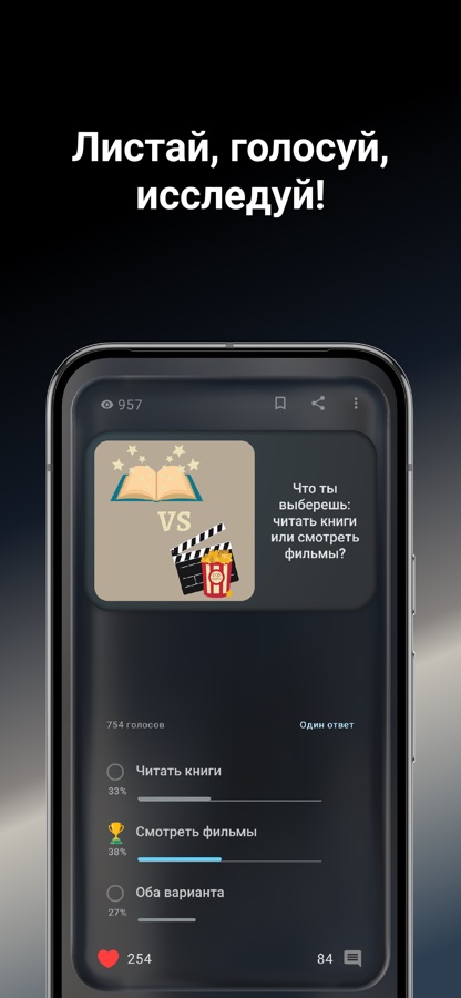 — Листайте, голосуйте и комментируйте – Быстро просматривайте опросы, делитесь своим мнением и участвуйте в обсуждениях