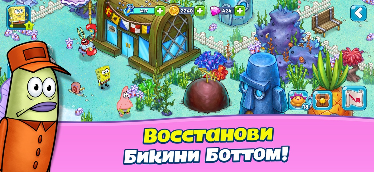 Готовь крабсбургеры и варенье, а также выращивай урожай, чтобы помочь вернуть Бикини Боттом былой вид!