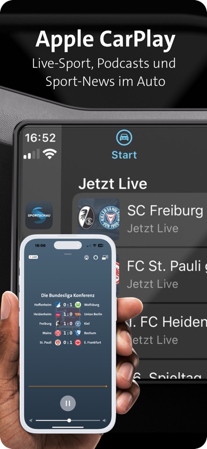 Das funktioniert auch im Auto: Mit Apple Carplay kannst du dein App-Erlebnis ins Auto verlängern. Genieße Live-Sport beim Fahren, tauche in unsere Podcasts ein oder informiere dich aktuell über die wichtigsten Sportereignisse während du unterwegs bist.