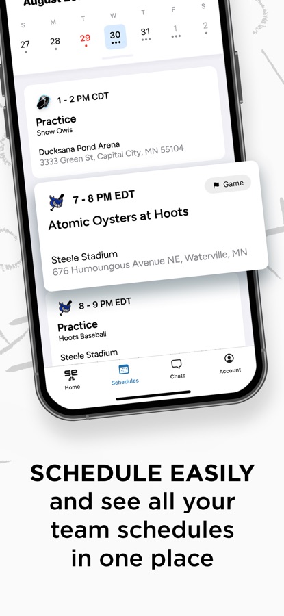 Our team app puts an end to last-second emails and phone calls. Access your latest team sports schedule and team chat right on SportsEngine. Manage team games with ease and ensure parents and families show up at the right place at the right time with no extra effort from you. Just use our easy-to-use team chat to keep up with the latest developments.